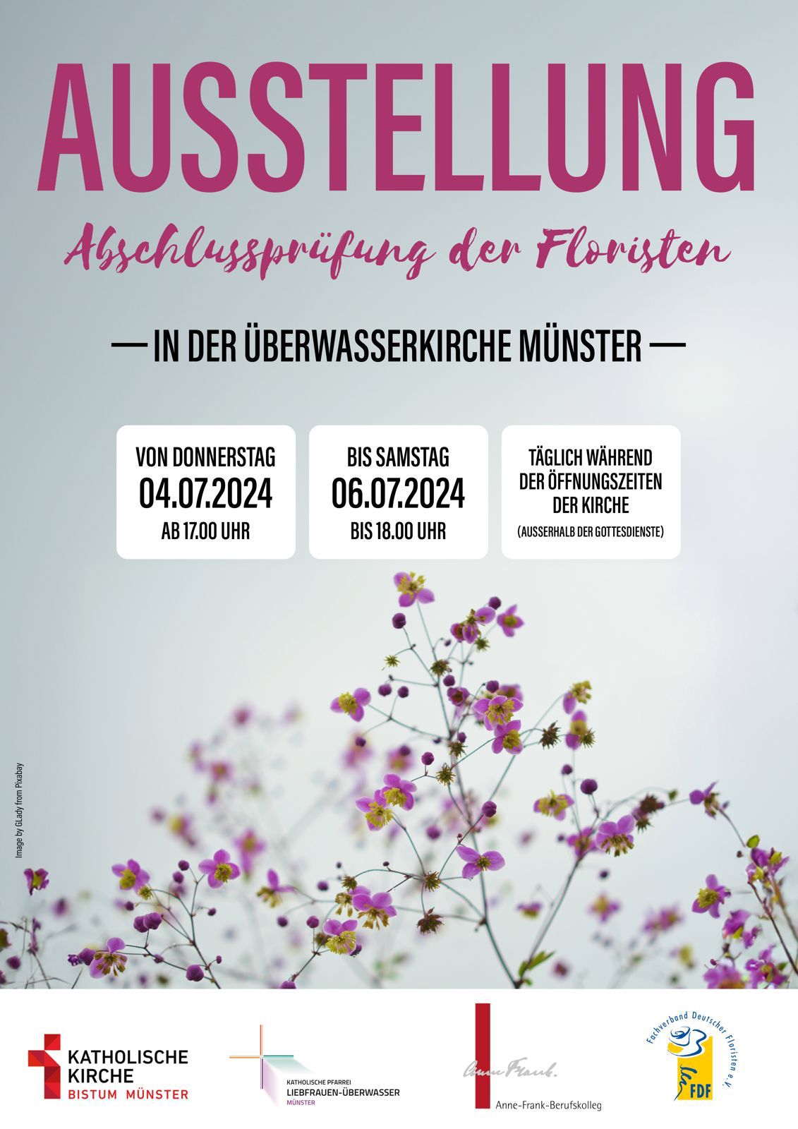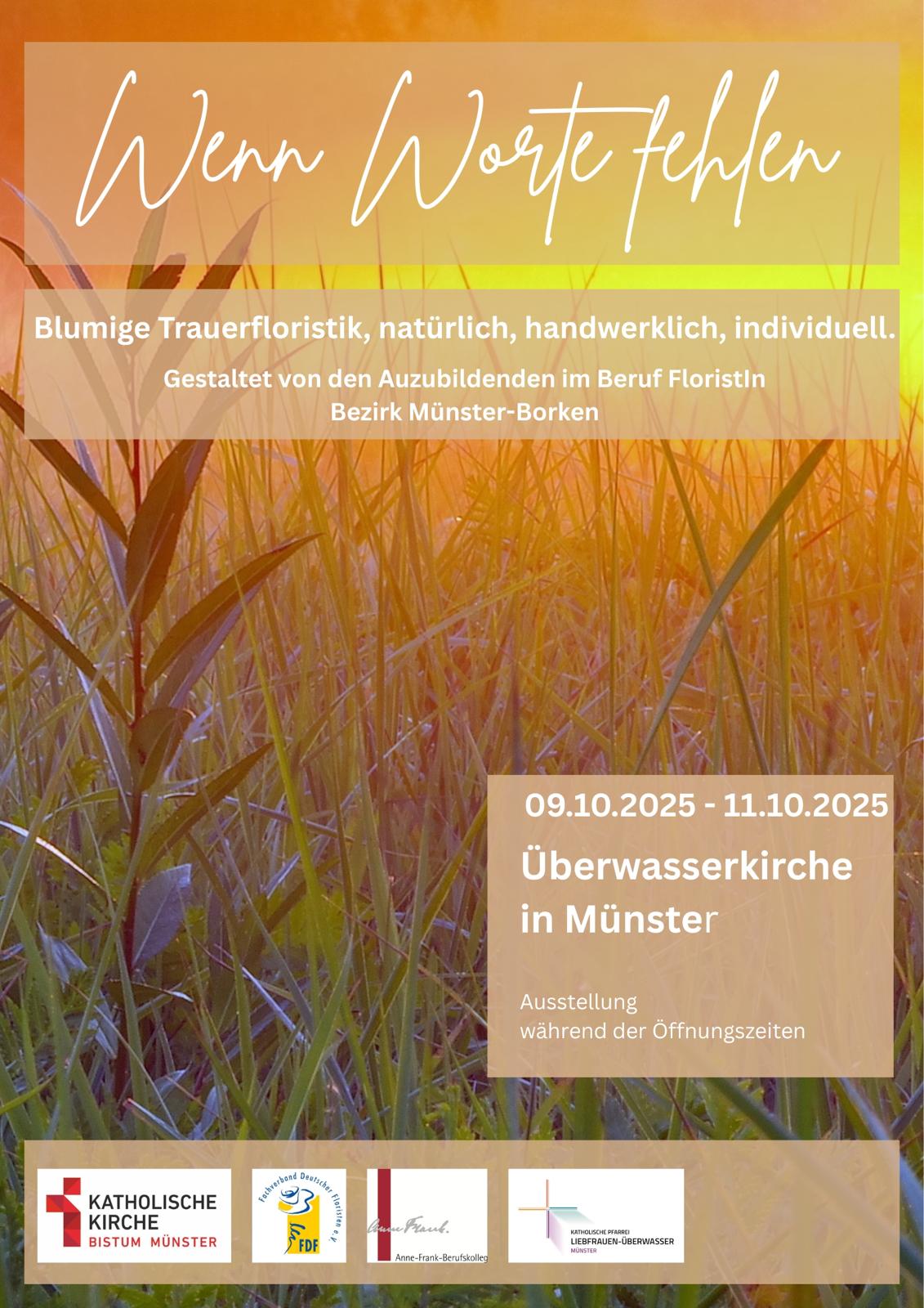 Von Donnerstag, 09.10.2025 bis Samstag, 11.10.2025 präsentieren Florist-Auszubildende der FDF-Bezirksstelle Borken-Münster „Blumige Trauerfloristik: natürlich, handwerklich, individuell“ in der Überwasserkirche (Liebfrauenkirche) in Münster. Eine Besichtigung der Werkstücke ist zu den regulären Öffnungszeiten möglich.
